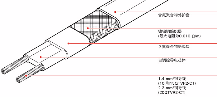 二、結構:1、銅導線:1.4mm2、2.3mm2 2、自調控導電芯3、含氟聚合物絕緣層4、鍍錫銅編織層5、含氟聚合物外護套